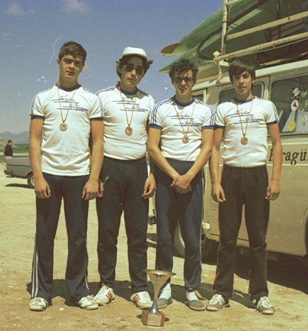 Santiago Simón Fernández y Manuel Campos Rodríguez (Esc. P. Aranjuez) Medalla de Bronce en la categoría Infantiles K-2, 500 m., y José Antonio Martínez González y Juan Carlos Nieto Castellanos con la medalla de bronce en la categoría C-2 500 m., del Equipo del Club Escuela de Piragüismo Aranjuez con el trofeo de los 5º clasificados en el Campeonato de España de club, en carreras en línea, de Cadetes e Infantiles, celebrado en el Pantano Virgen del Llano en Aguilar de Campoo (Palencia) el 18 y 19 de Julio de 1981.