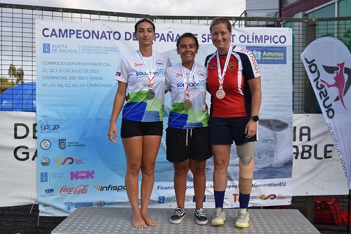 Sandra Ortega Carrascosa, y Miriam González Oro del Club Escuela de Piragüismo Aranjuez, campeona y subcampeona en la categoría mujer senior PK3, 500 metros en el LIV Campeonato de España de Sprint Olímpico, celebrado en el embalse de Pontillón de Castro, Pontevedra, el 21 de julio de 2023.