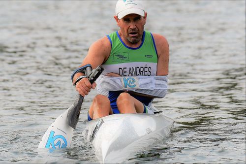 Juan Antonio Gómez Núñez del Club Escuela de Piragüismo Aranjuez, campeón en la categoría hombre veterano PK·, 500 metros en el Campeonato de España de Sprint Máster 2025 celebrado en Mequinenza (Zaragoza) el 23 de agosto del 2025.